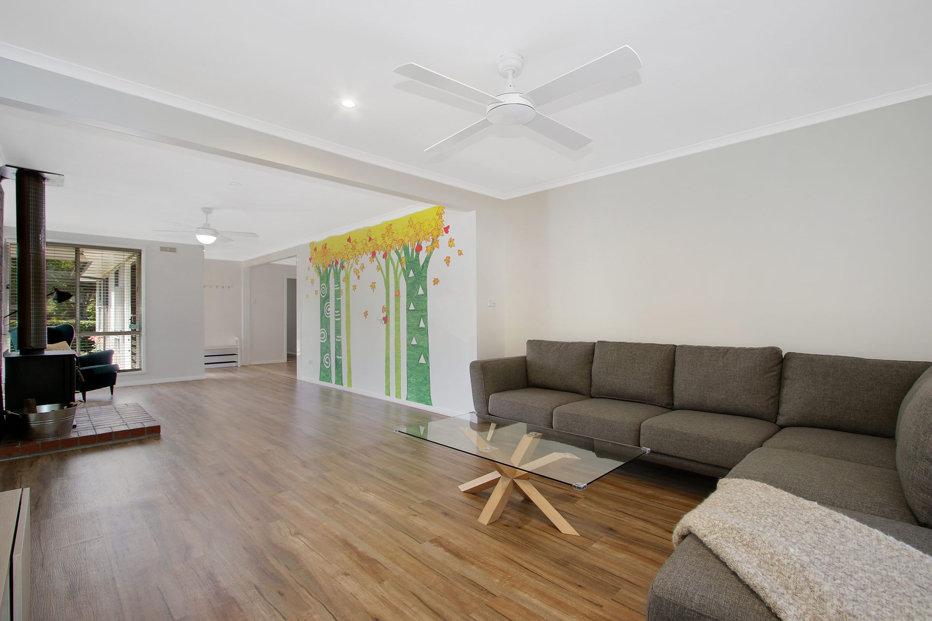 The large living room is the heart of the home, featuring a wood heater, flat-screen TV, comfy lounge suite, massage chair, beanbags, and a great selection of board games. Timber floating floors add a sense of space and freshness throughout.