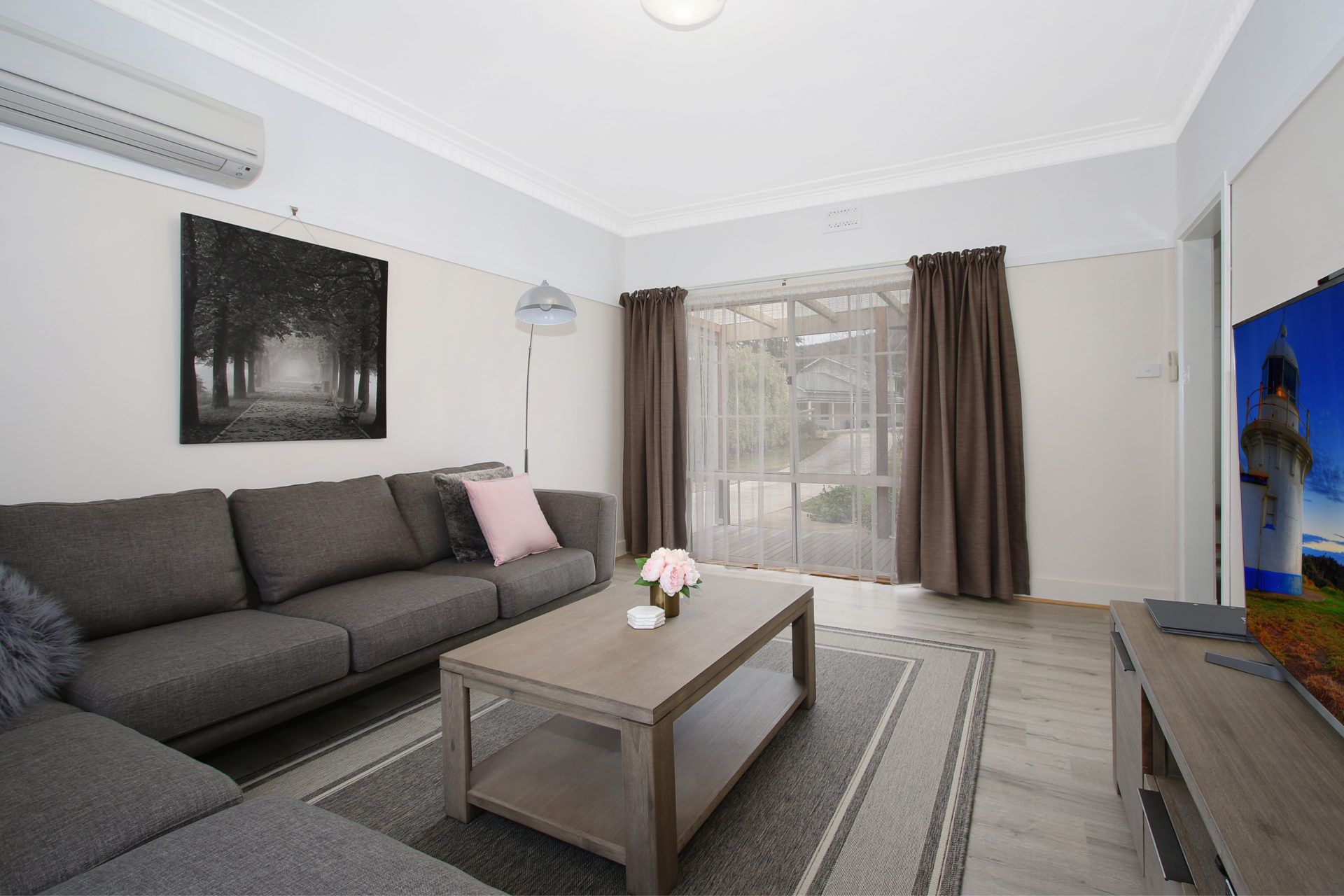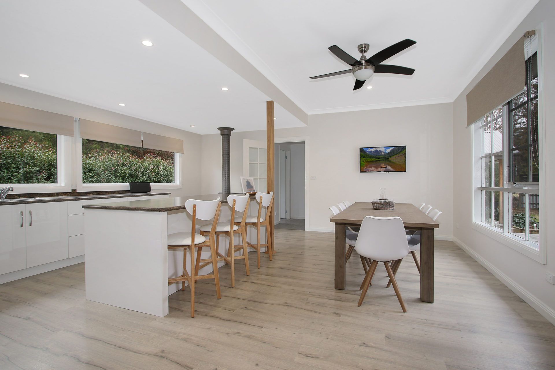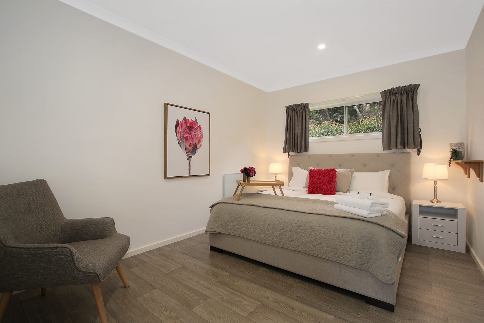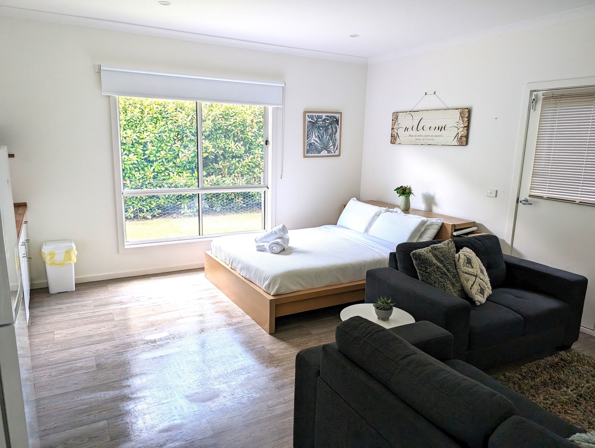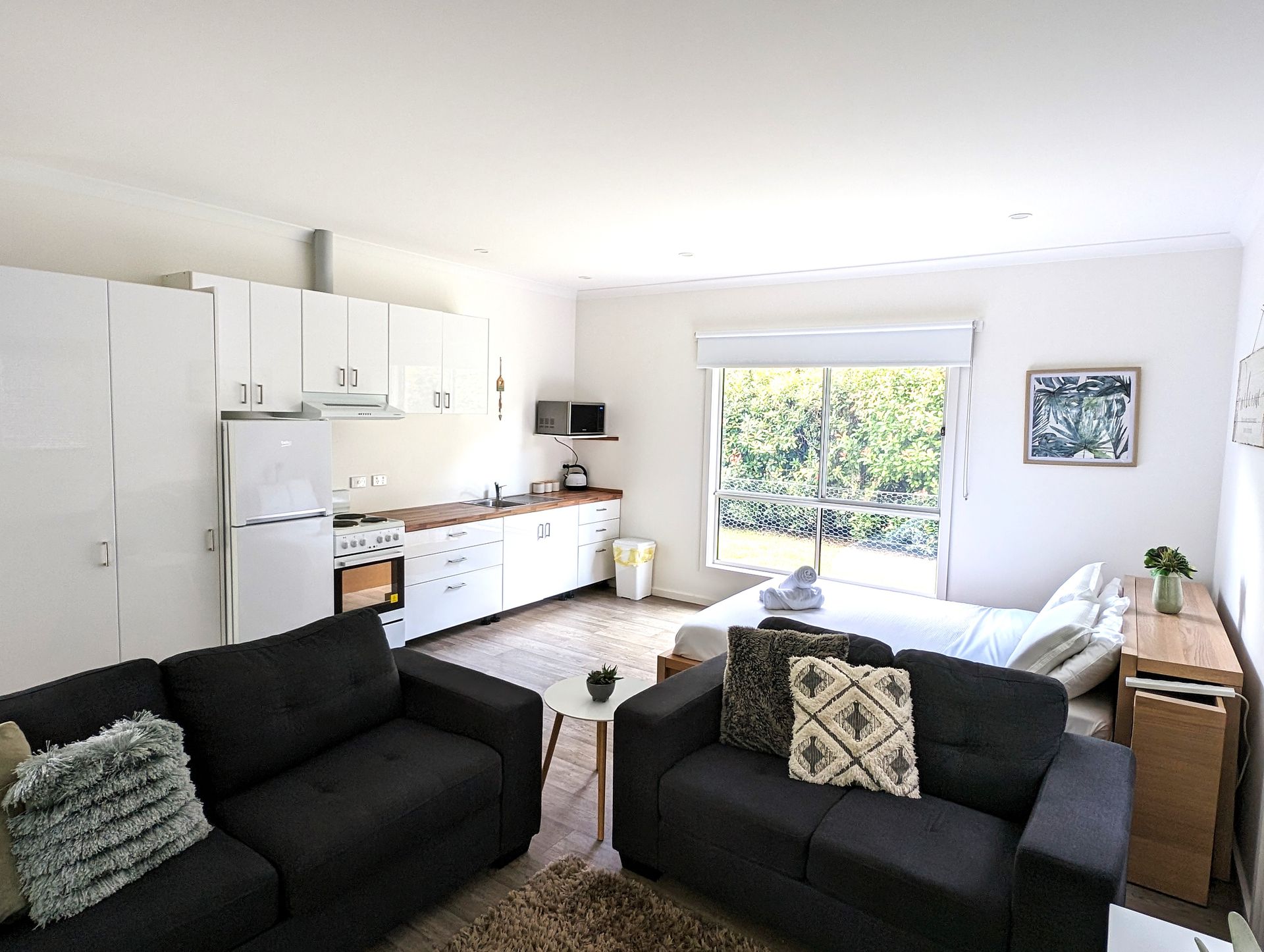 Inside, the main house features an open-plan living and dining area with a cozy wood fire and split-system heating and cooling. A fully equipped kitchen, large dining table, and multiple living zones provide plenty of room for everyone to relax. The rear studio section of the home is self-contained with its own kitchenette, living space, and bathroom perfect for extended families or couples travelling together.