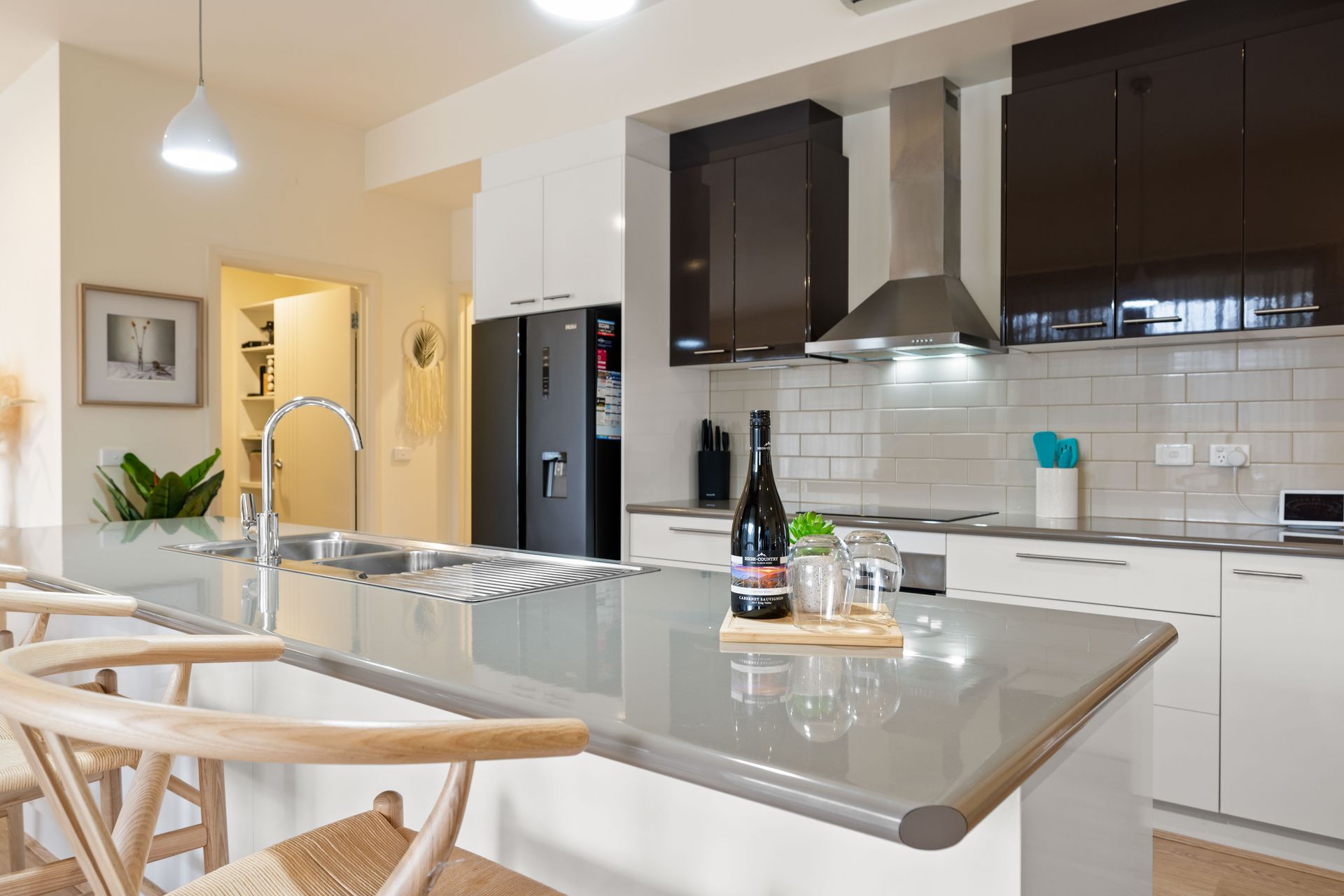 The kitchen is a standout feature, complete with modern appliances including an electric cooktop and oven, double-drawer dishwasher, butler’s pantry, and double sink. Whether you’re cooking a full meal or enjoying takeout from one of Bright’s gourmet spots, this space makes it easy.