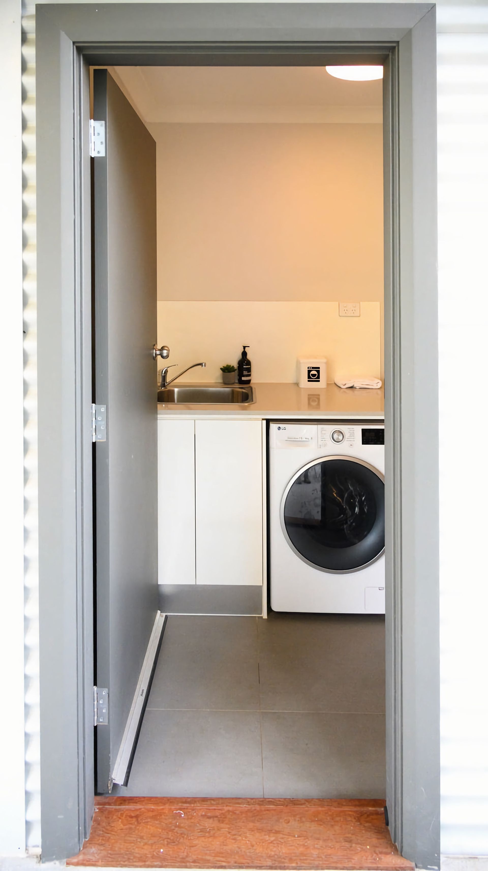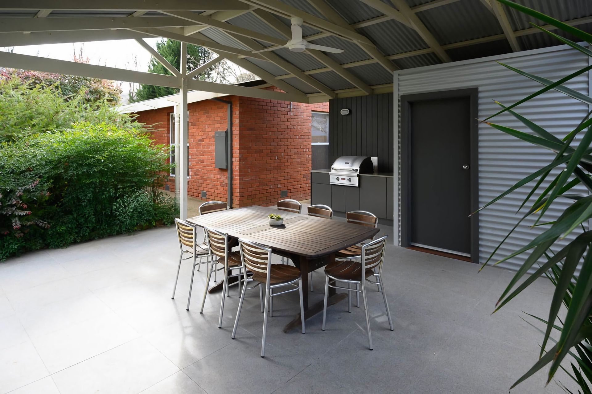 Inside, the home is warm, welcoming, and stylishly decorated. Enjoy the spacious living area with comfortable seating, large Samsung TV with sound system, and a dining table for six. A sliding door leads to a private, fenced courtyard perfect for morning coffee or evening drinks.