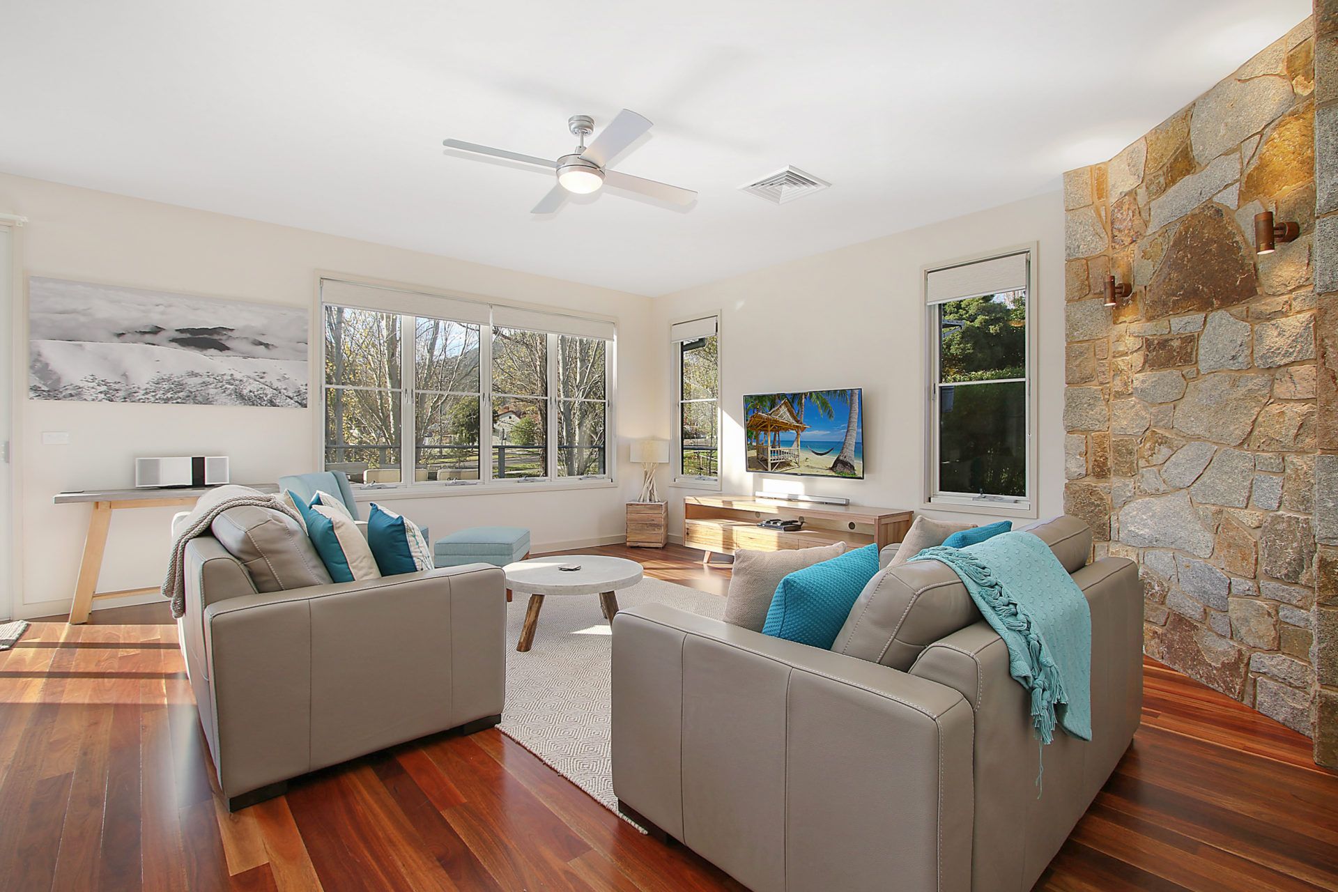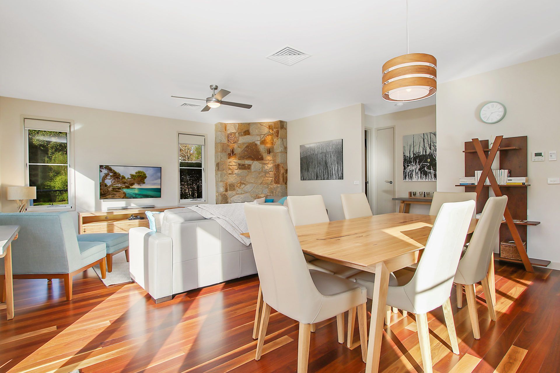 Inside, enjoy a spacious open-plan living area featuring spotted gum flooring, a gas log fire, and stylish leather furnishings. The modern kitchen is fully equipped with an electric cooktop, large oven, microwave, coffee machine, milk frother, breakfast bar, and all the essentials you need to cook up a storm. The adjacent dining area seats six, perfect for enjoying a home-cooked meal.