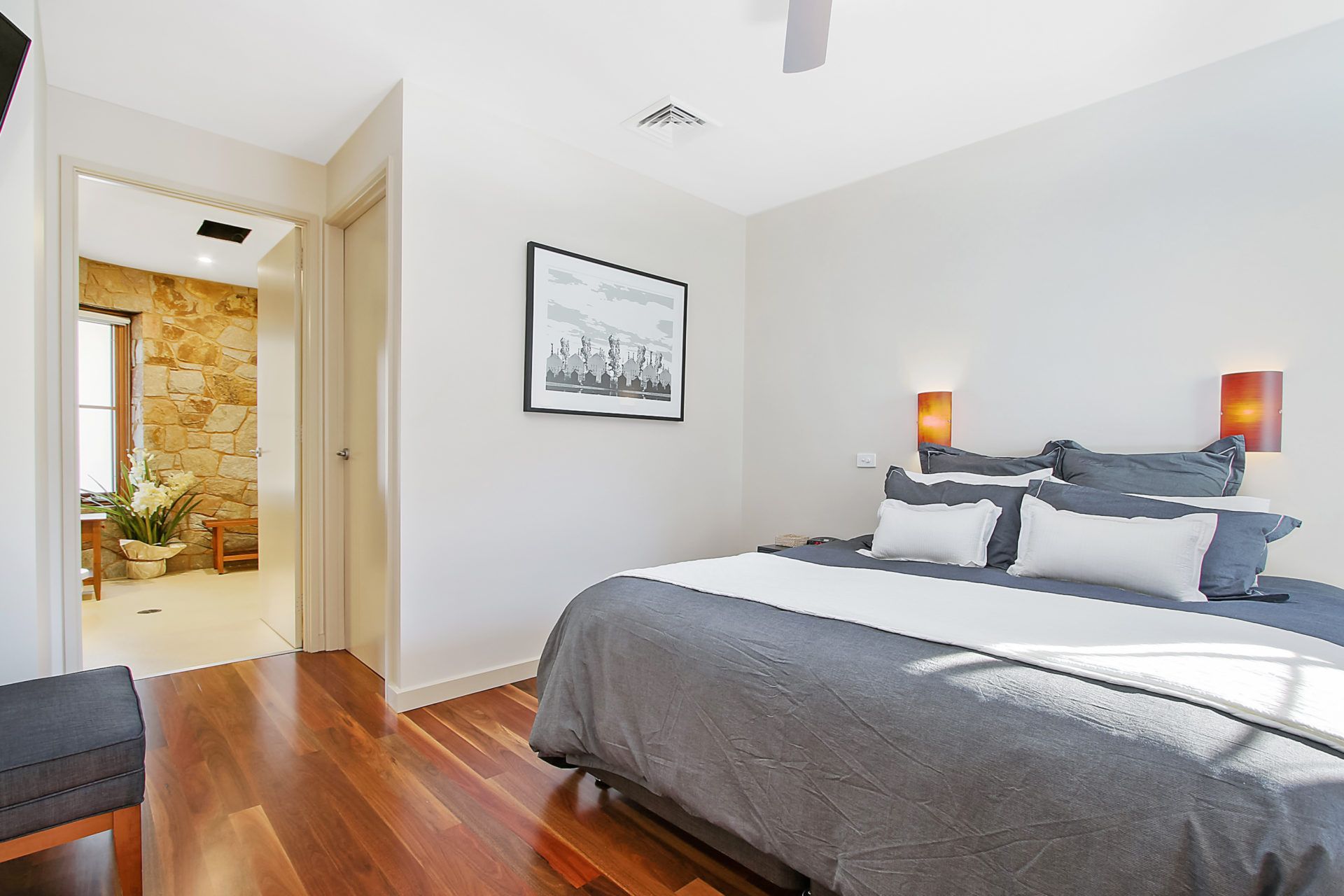 Step into one of two private master bedrooms, each with their own ensuite bathroom featuring large walk-in showers, vanities, and quality finishes. Both bedrooms are fitted with wall-mounted TVs and ducted heating/cooling for year-round comfort.