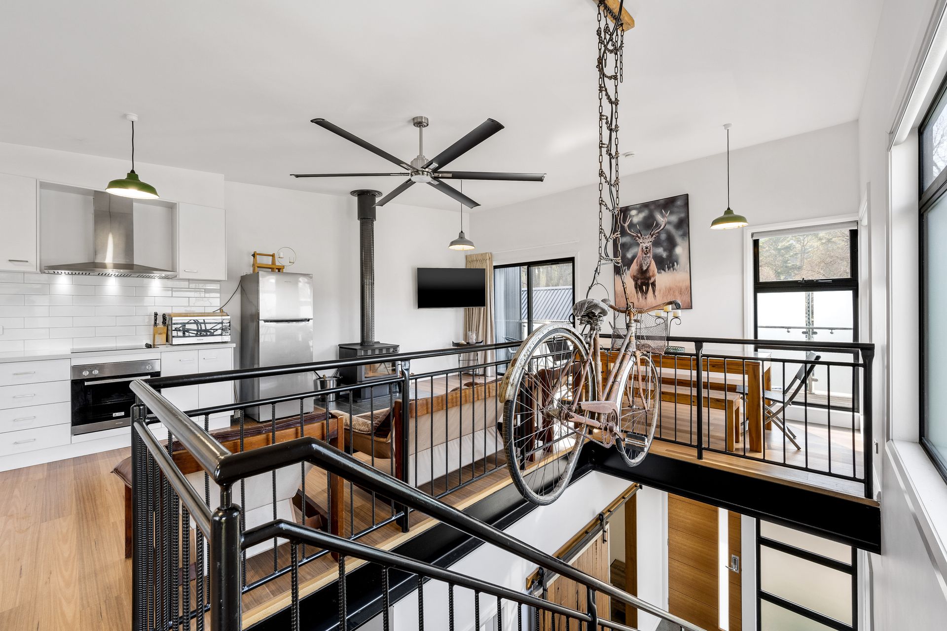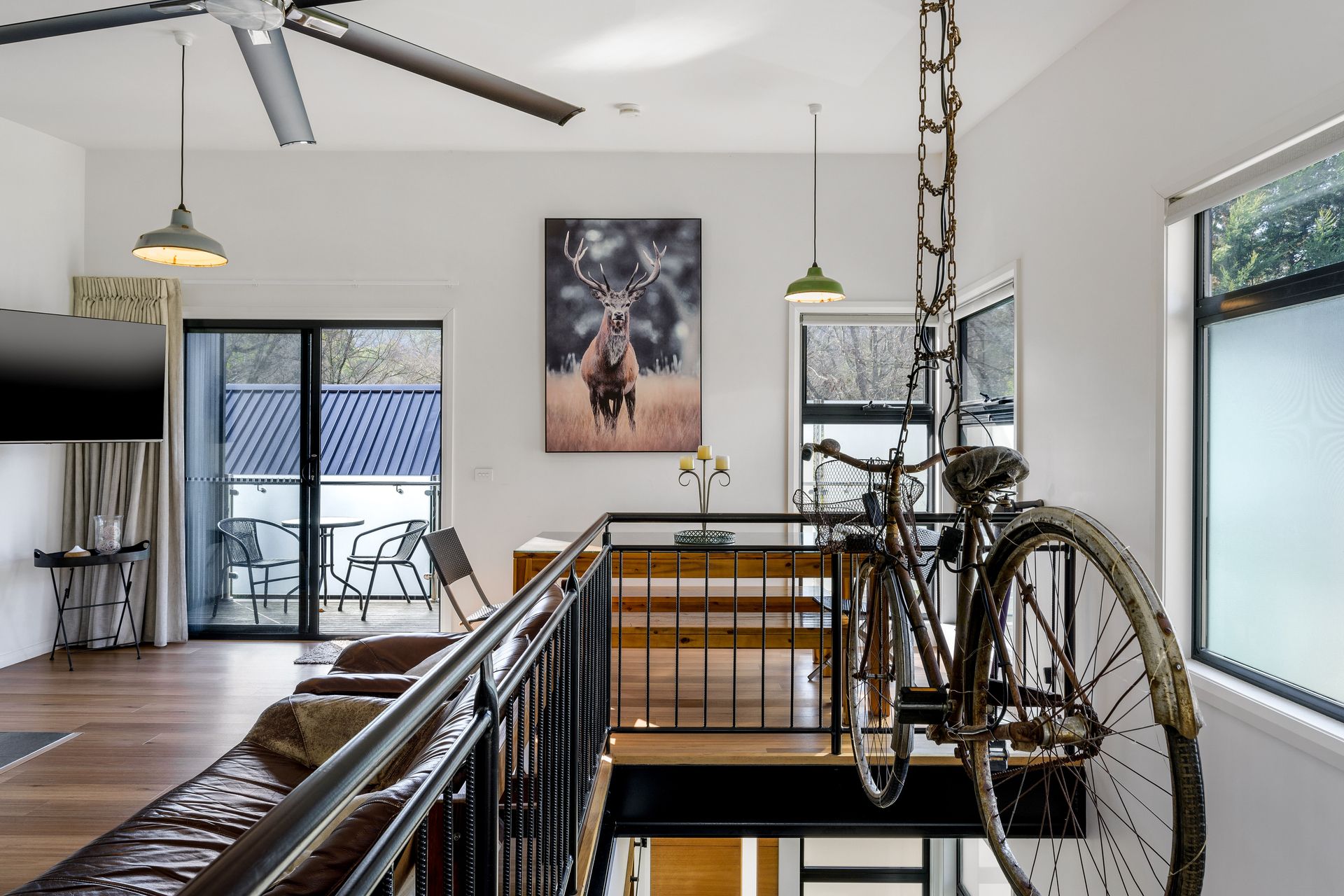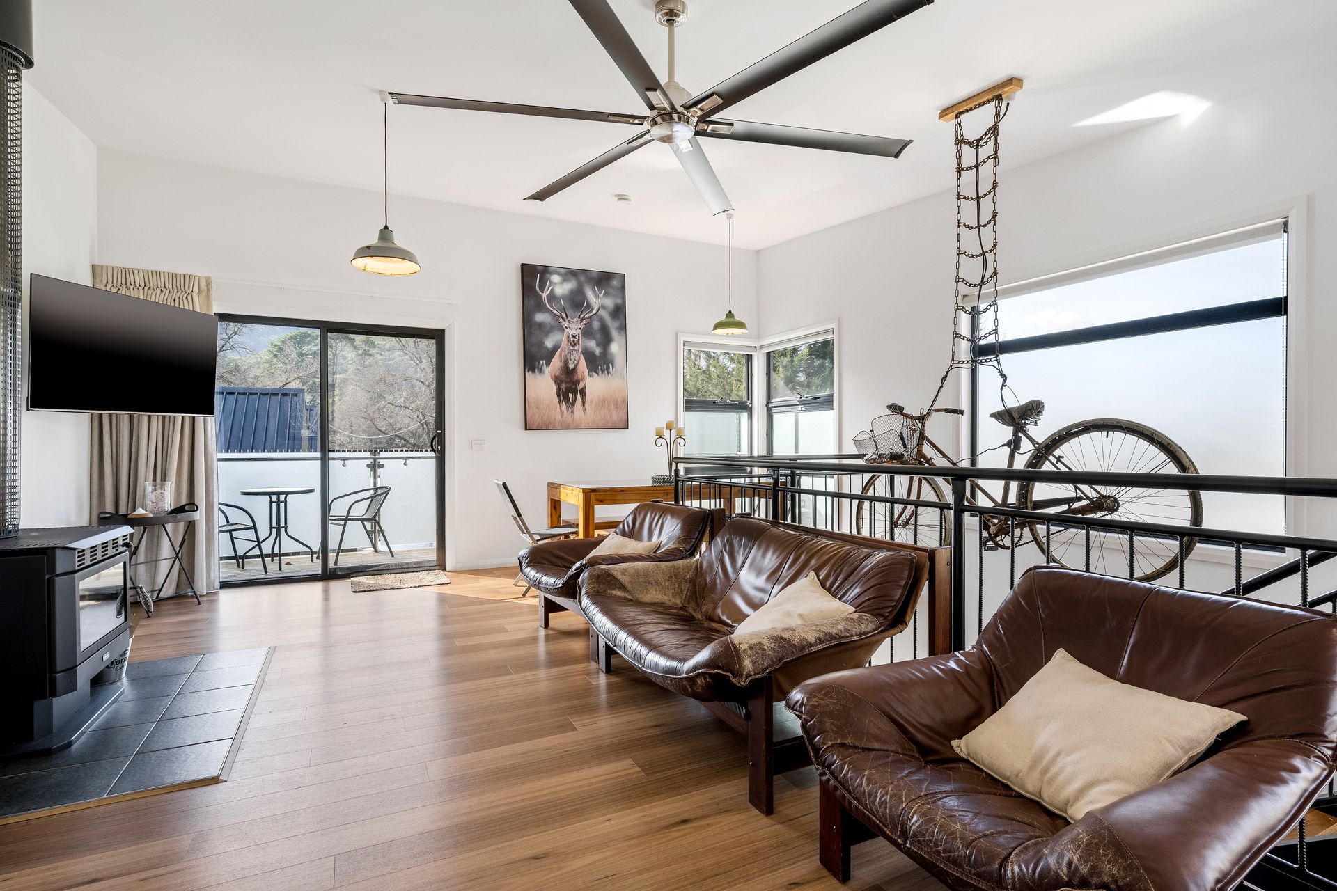 Crafted with timber, steel, and polished concrete finishes, the unit feels clean, modern, and welcoming. The stylish open plan upstairs living area features a comfortable lounge space with a wood heater, perfect for chilly alpine evenings. Step out onto either the front balcony or the rear outdoor deck, both offering serene, leafy views ideal for relaxing with a morning coffee or evening drink.