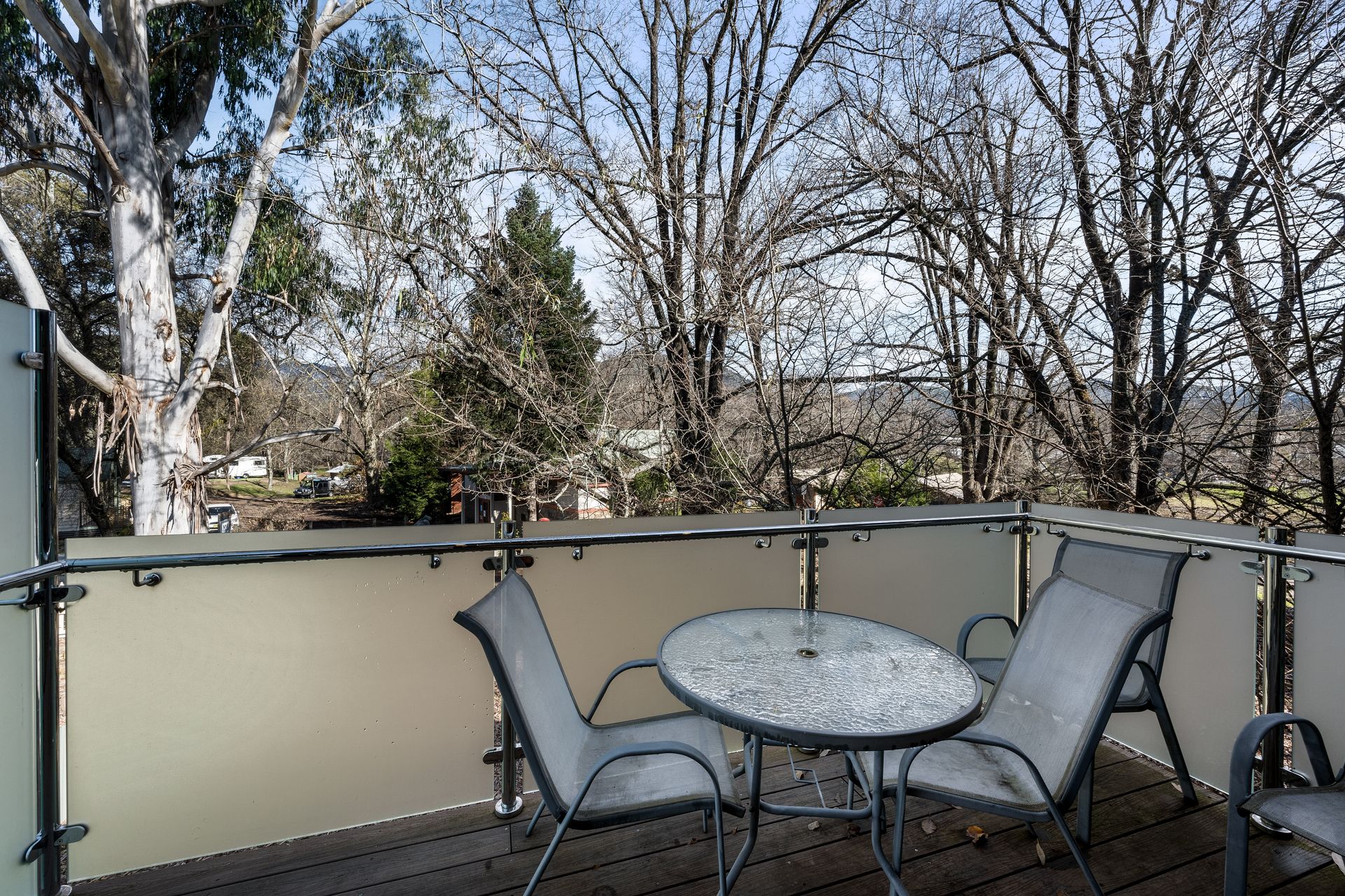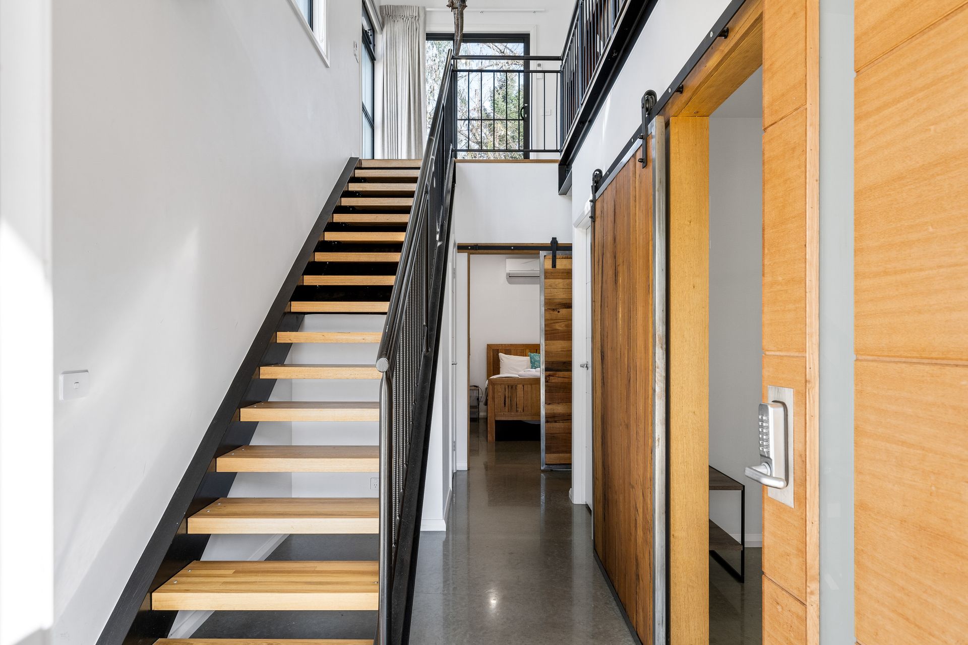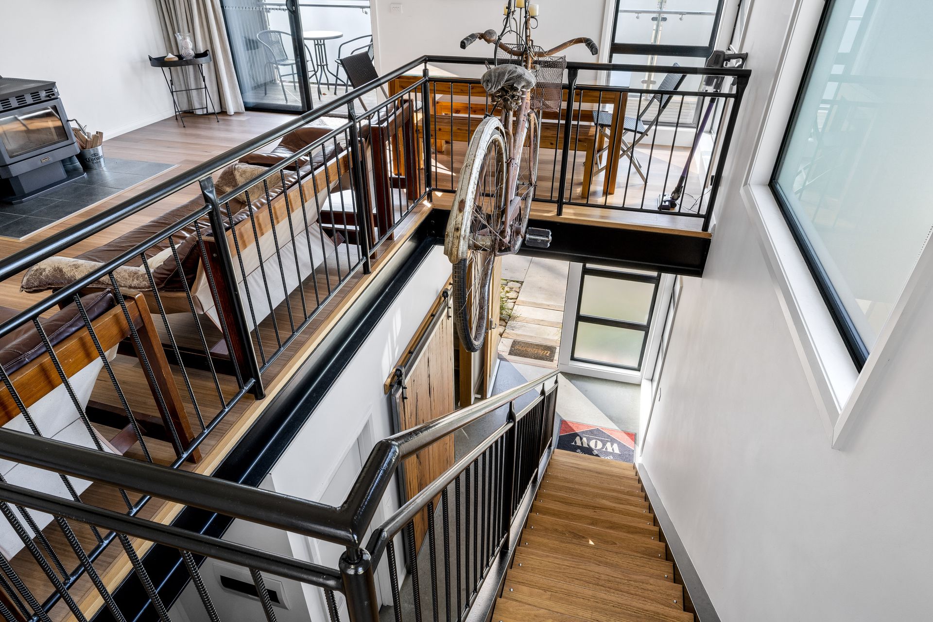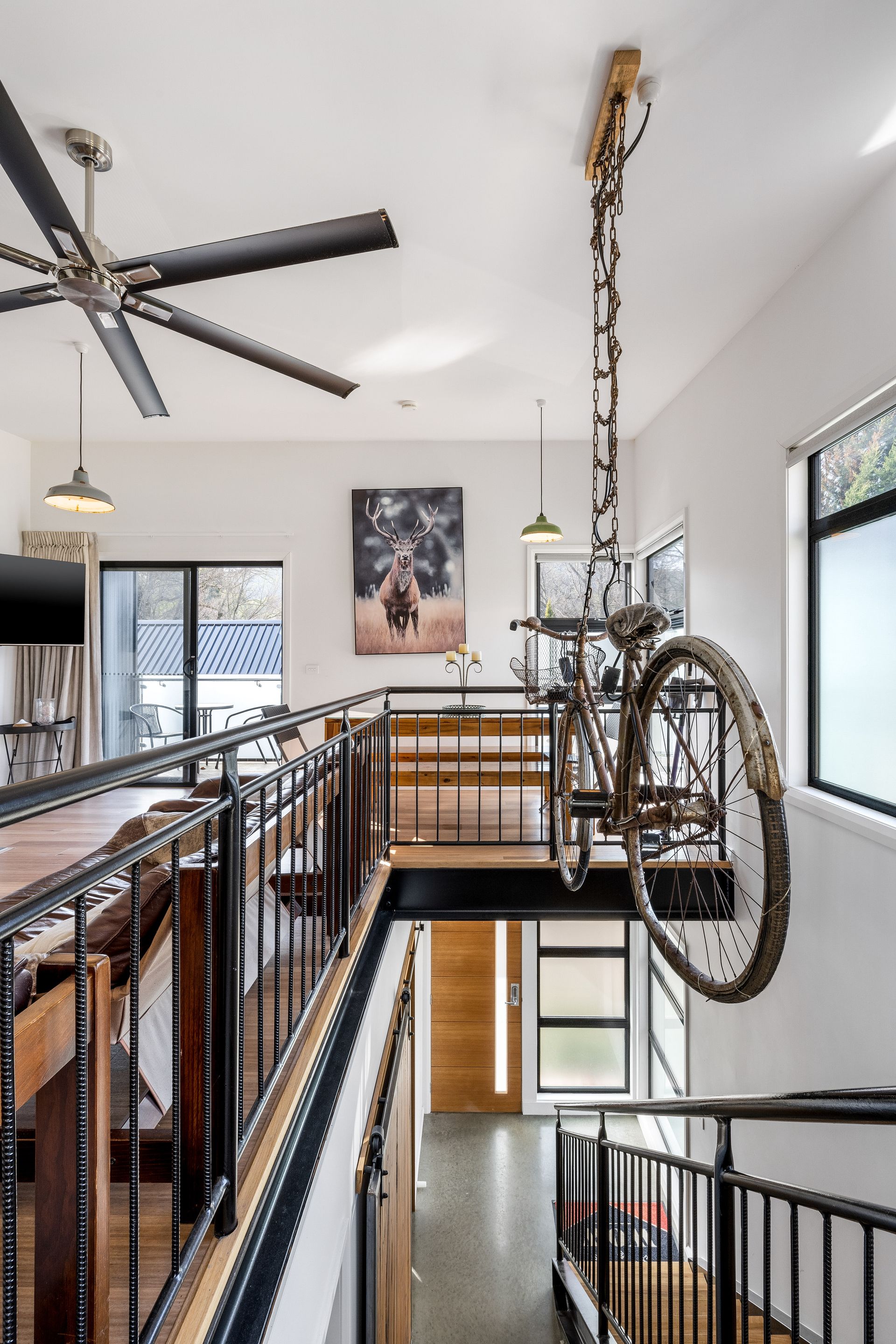 Crafted with timber, steel, and polished concrete finishes, the unit feels clean, modern, and welcoming. The stylish open plan upstairs living area features a comfortable lounge space with a wood heater, perfect for chilly alpine evenings. Step out onto either the front balcony or the rear outdoor deck, both offering serene, leafy views ideal for relaxing with a morning coffee or evening drink.