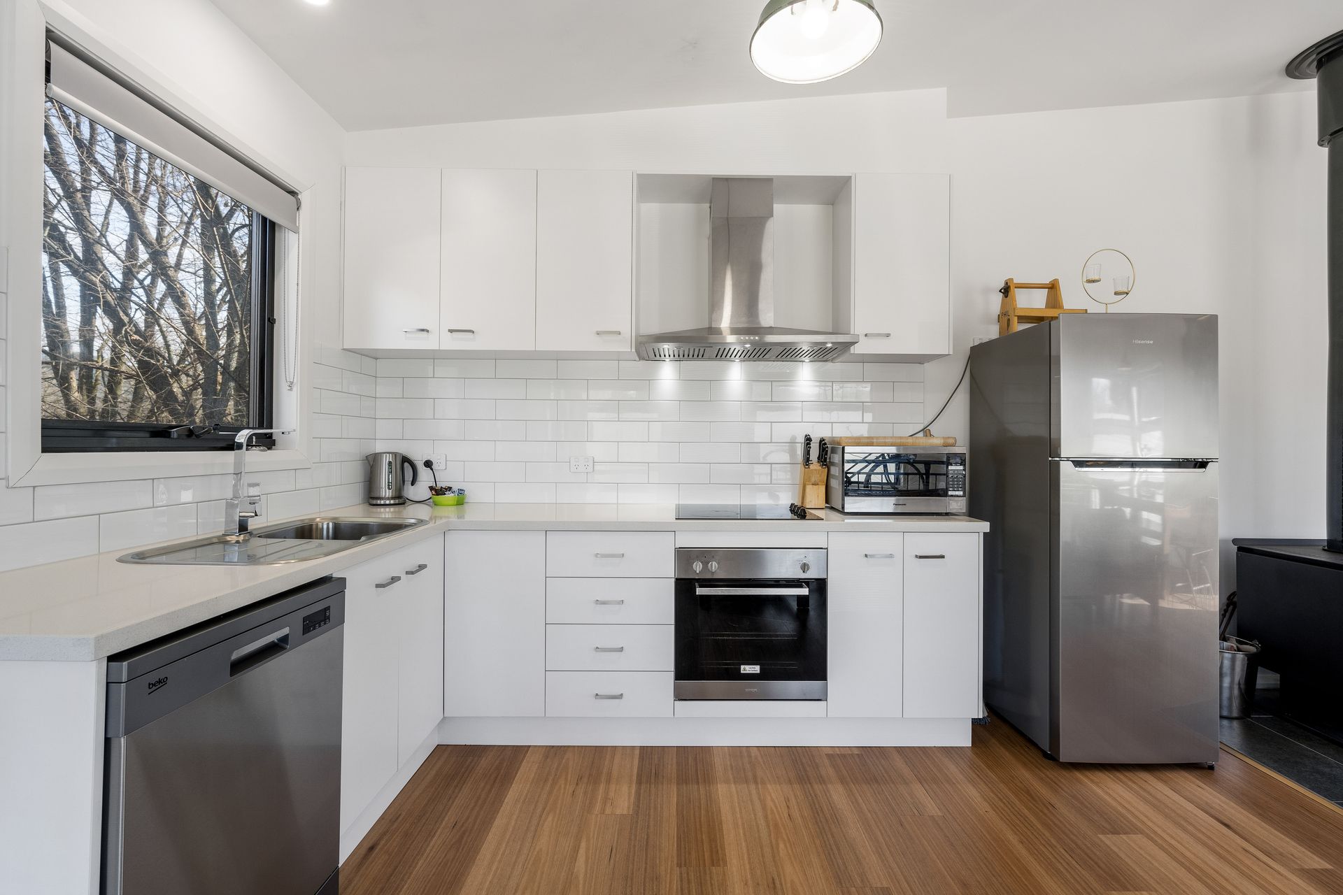 The fully equipped kitchen has everything you need to prepare meals at home, including a full-sized fridge, oven, electric cooktop, dishwasher, microwave, toaster, kettle, and essential cookware. A dining table is set for four, making mealtimes easy and enjoyable.