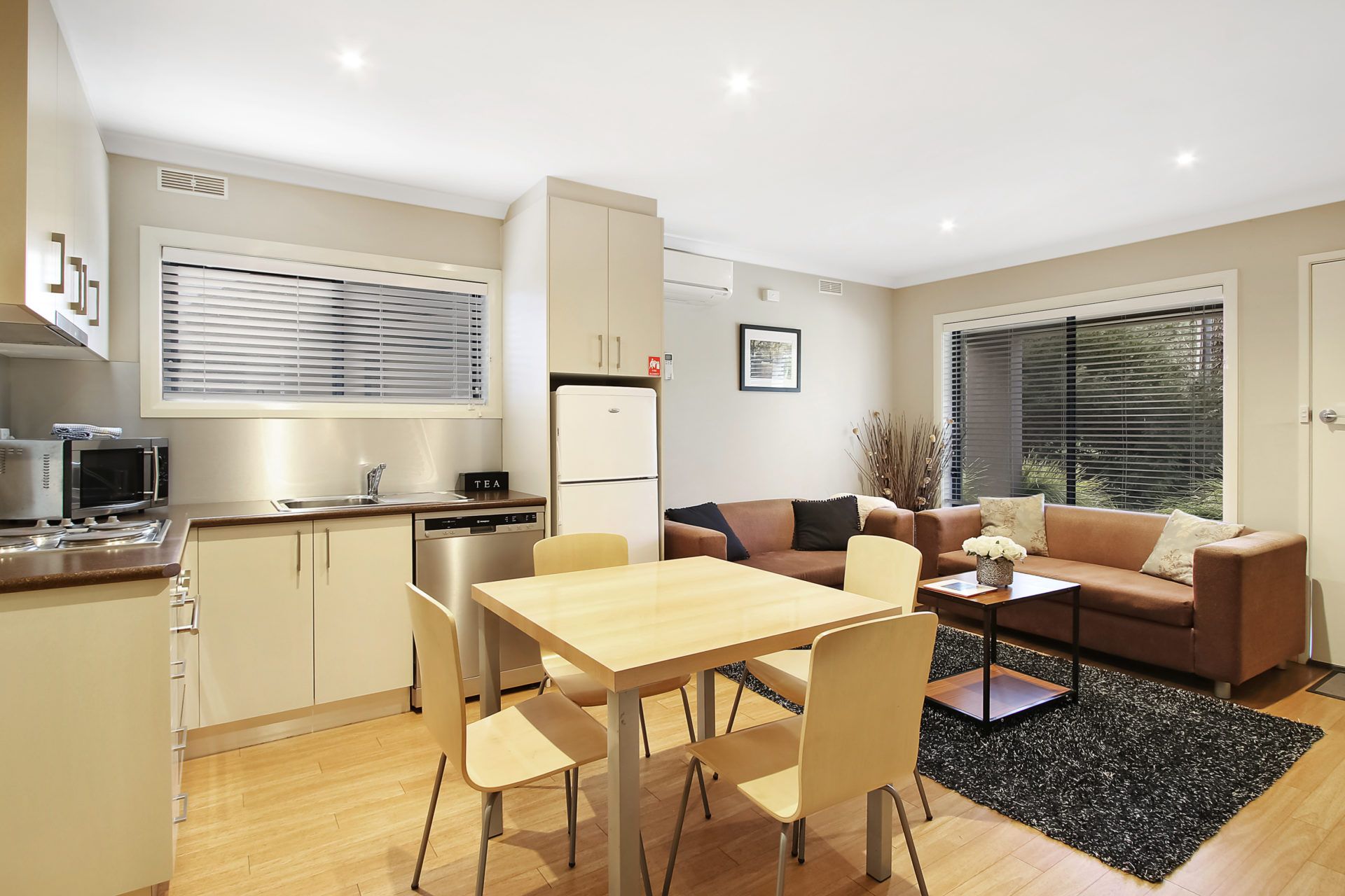 Each unit features two comfortable bedrooms, a well-equipped kitchen including oven, dishwasher, fridge/freezer, and all essentials for home-style cooking. The open plan living and dining area offers a welcoming space to relax, while reverse cycle air conditioning ensures year-round comfort.