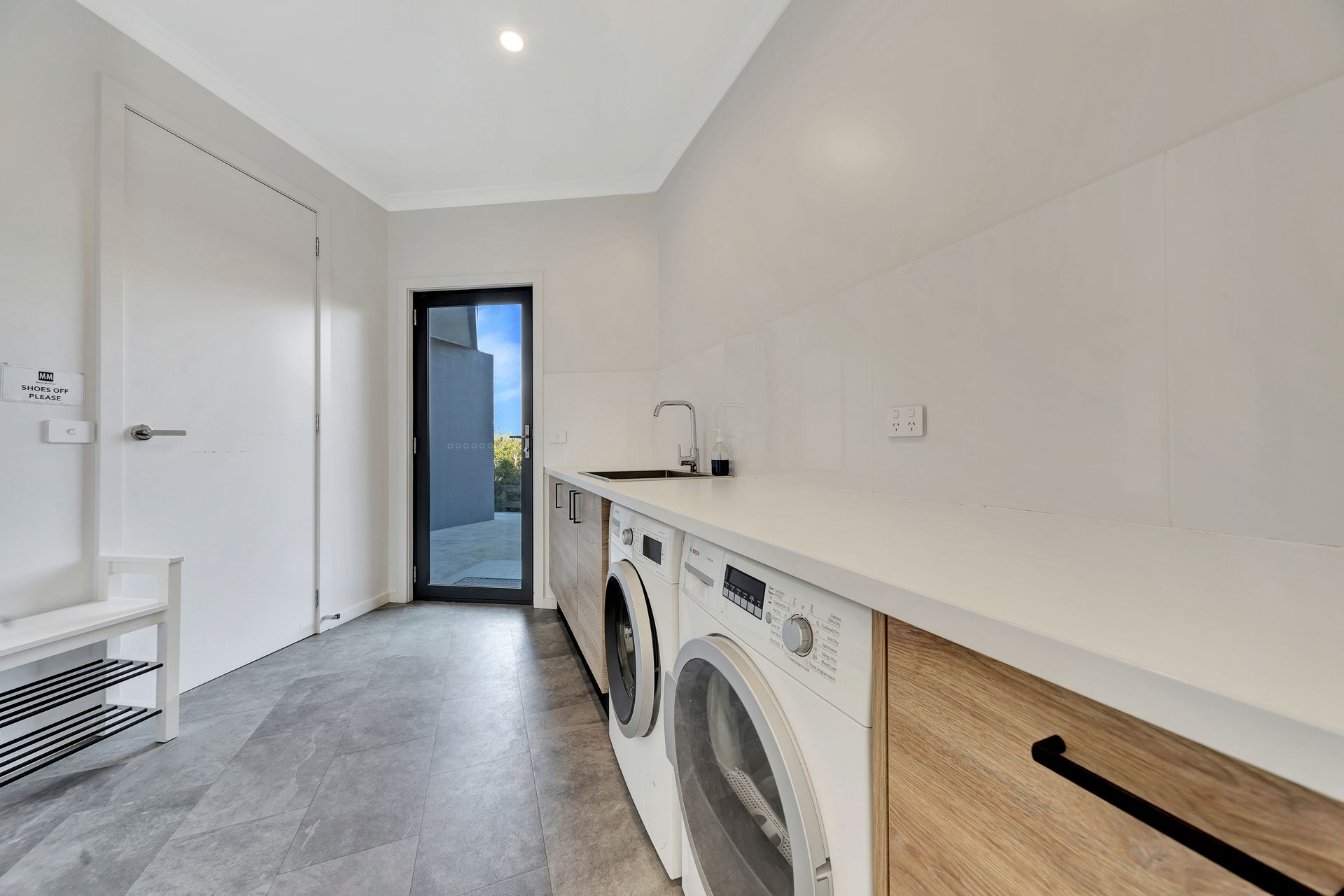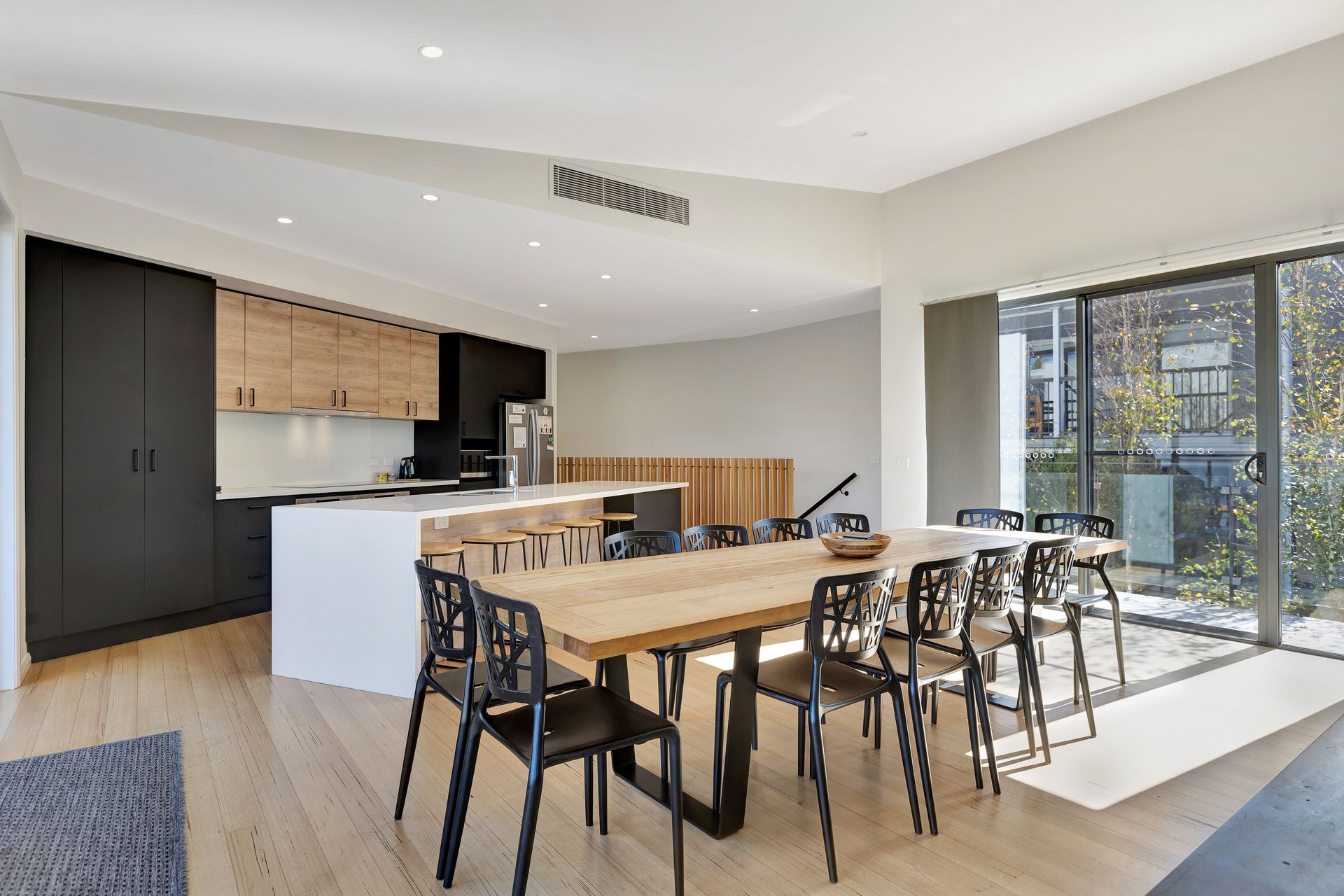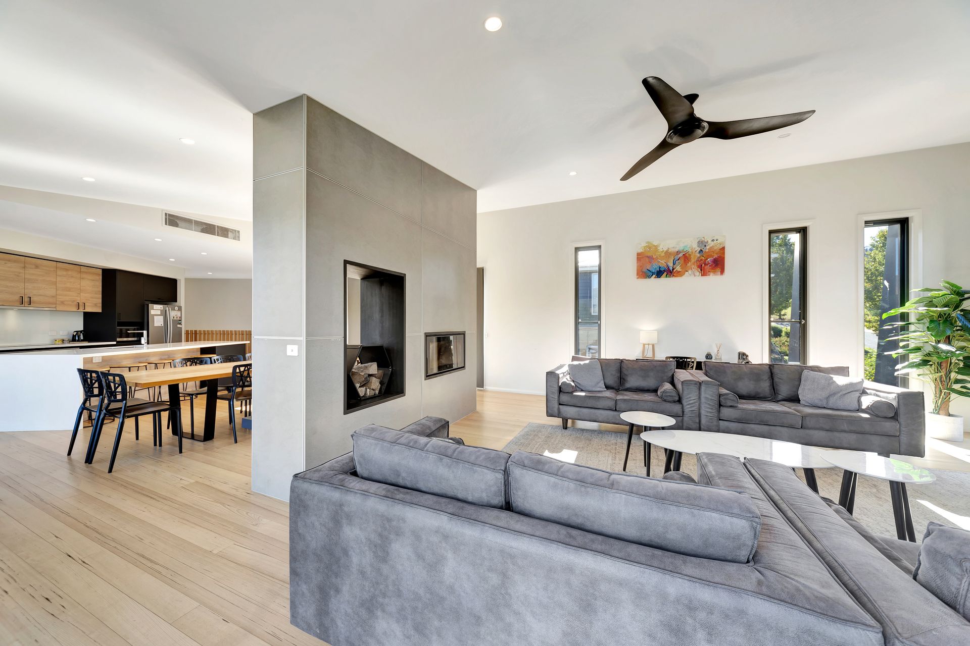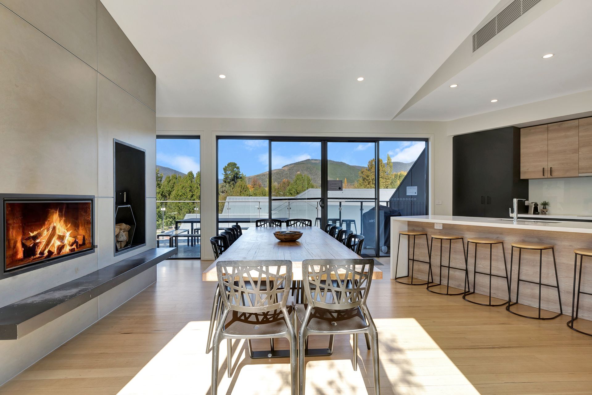 At the heart of the home is the open-plan kitchen, dining, and living space. Cook up a storm in the sleek, fully equipped kitchen, then gather around the custom timber dining table to share meals, stories, and laughter. A double-sided fireplace adds warmth and character, dividing the dining area from the relaxed lounge perfect for curling up with a movie or glass of wine.