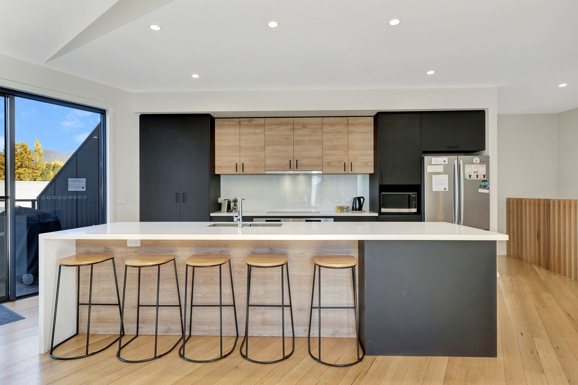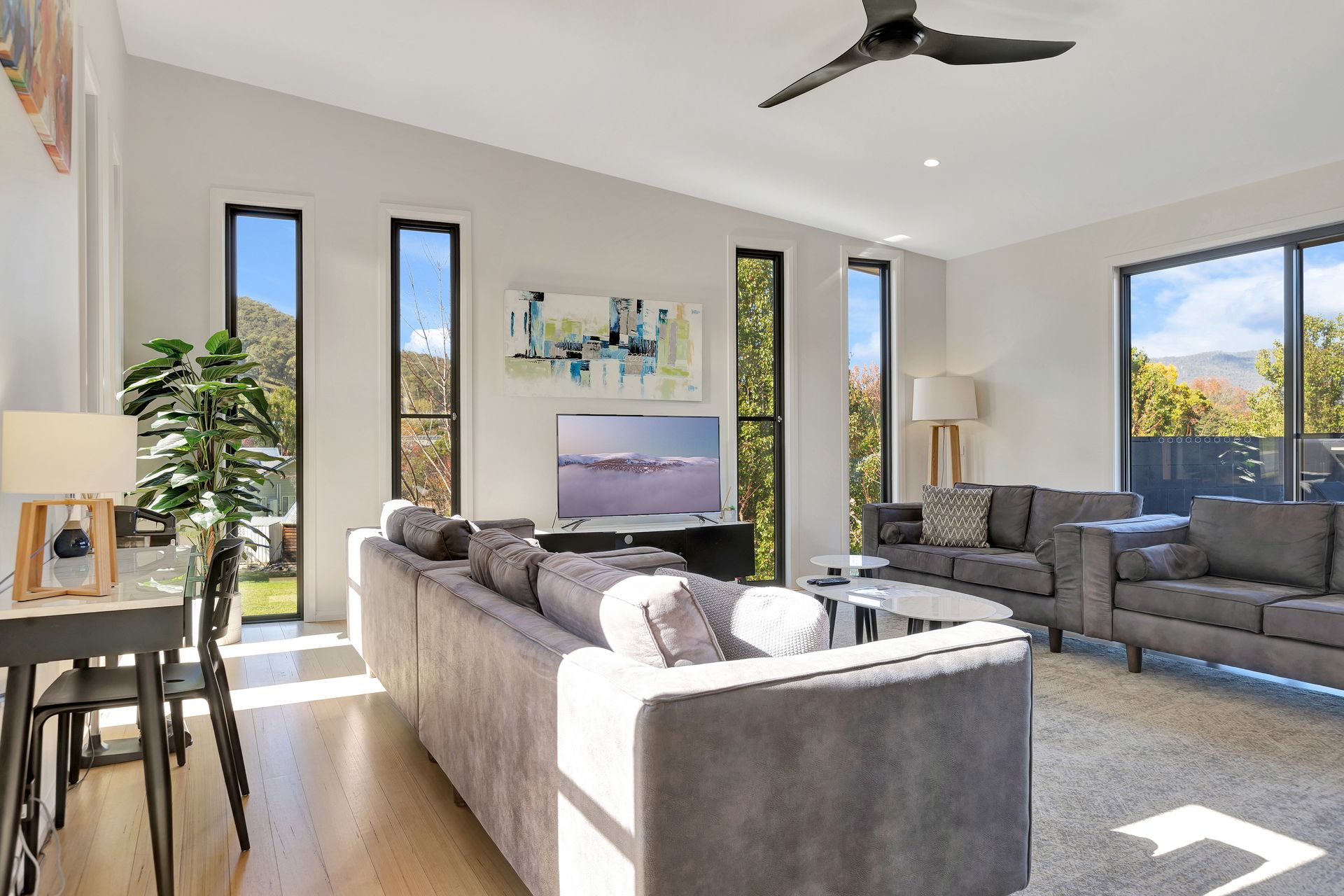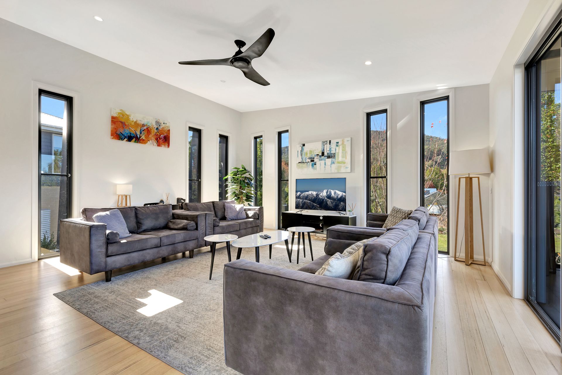 Spread over two stylish levels, this retreat blends natural finishes with contemporary comfort. You’ll be greeted by stunning polished concrete floors and a statement timber staircase, leading you to the light-filled upper level. Large windows frame breathtaking views of Mystic Mountain, creating a serene and inviting atmosphere.