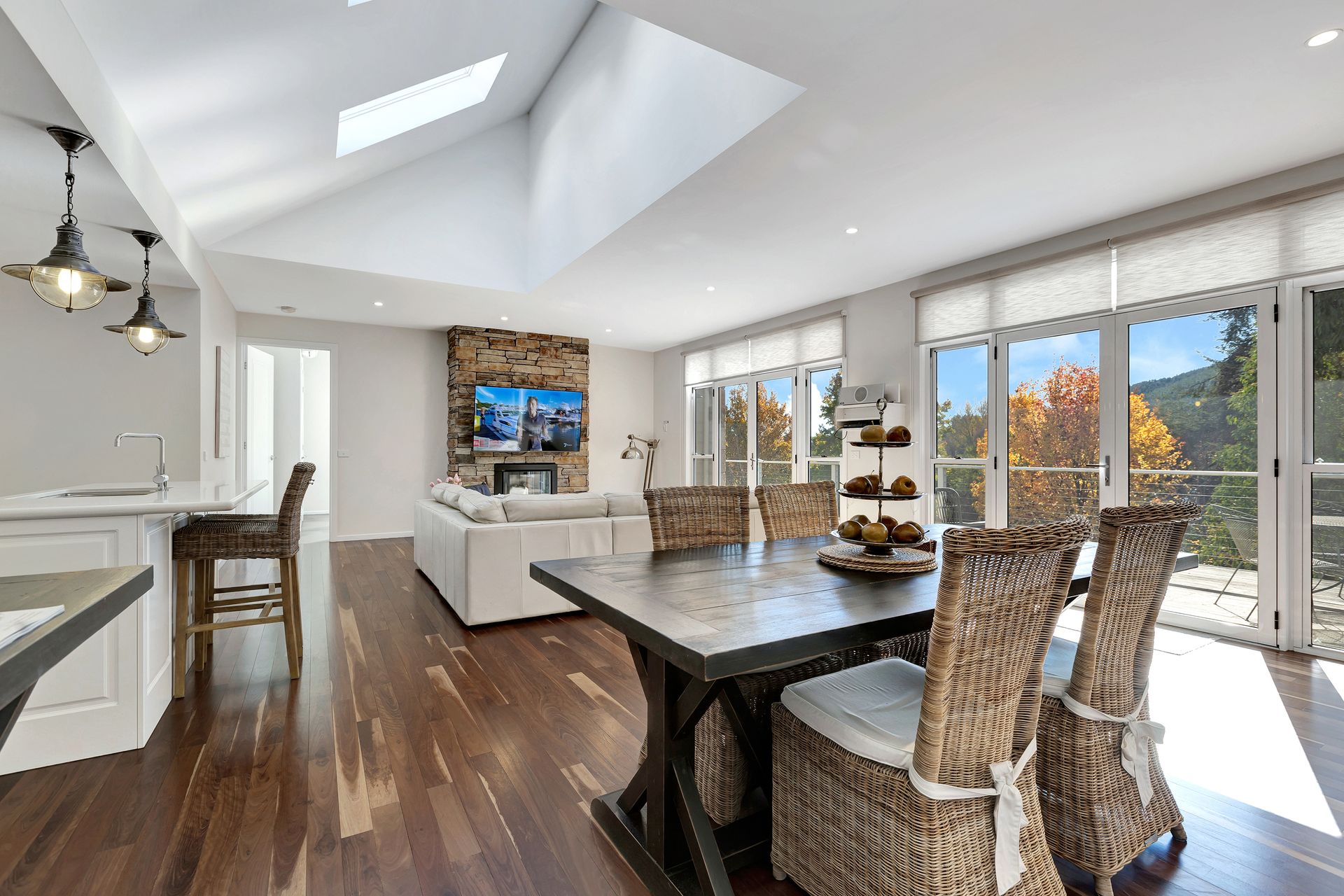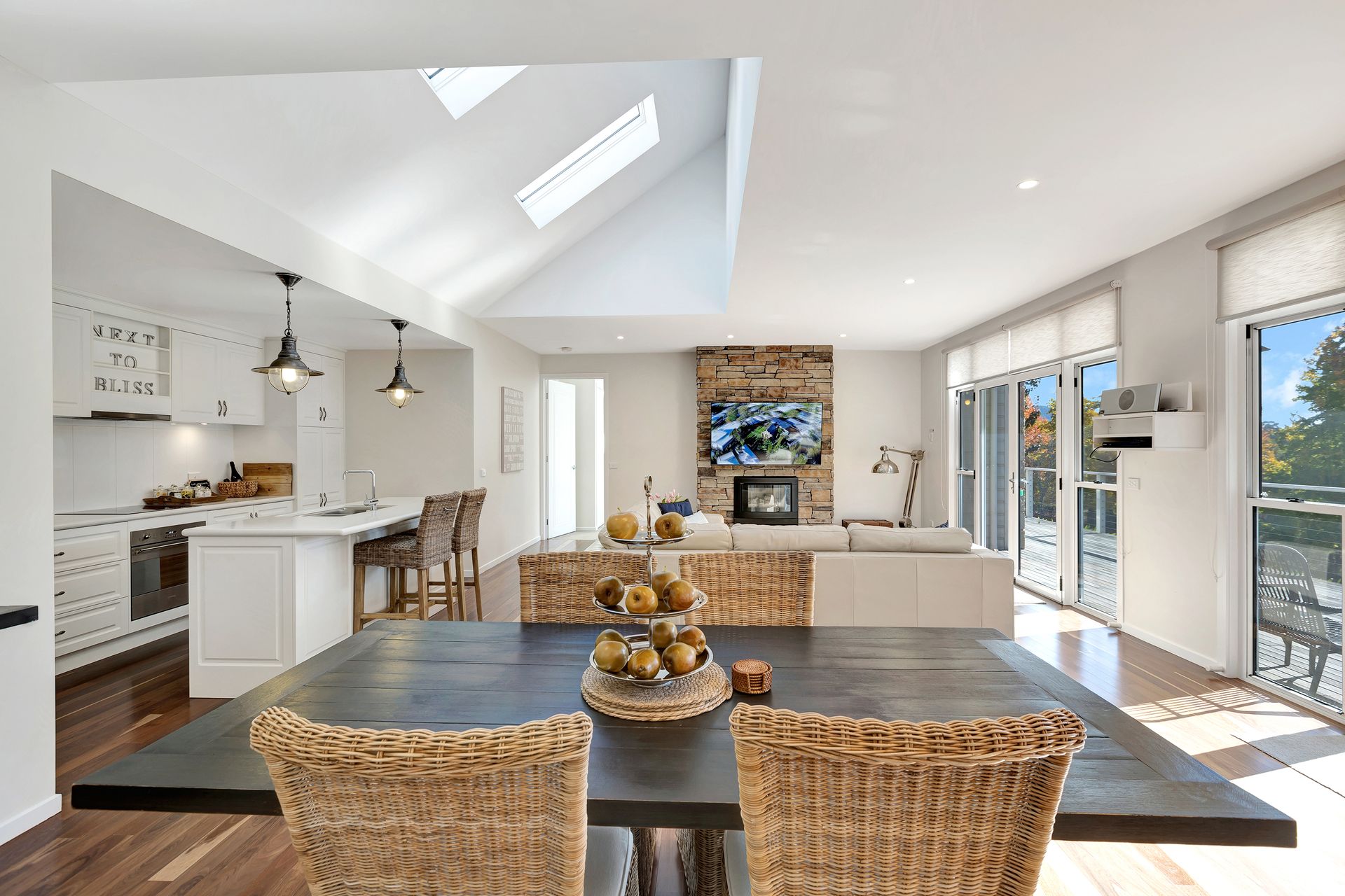 The open-plan living space includes a fully equipped gourmet kitchen and opens out to a private outdoor deck overlooking the Rail Trail perfect for al fresco dining or morning coffee among the gum trees.