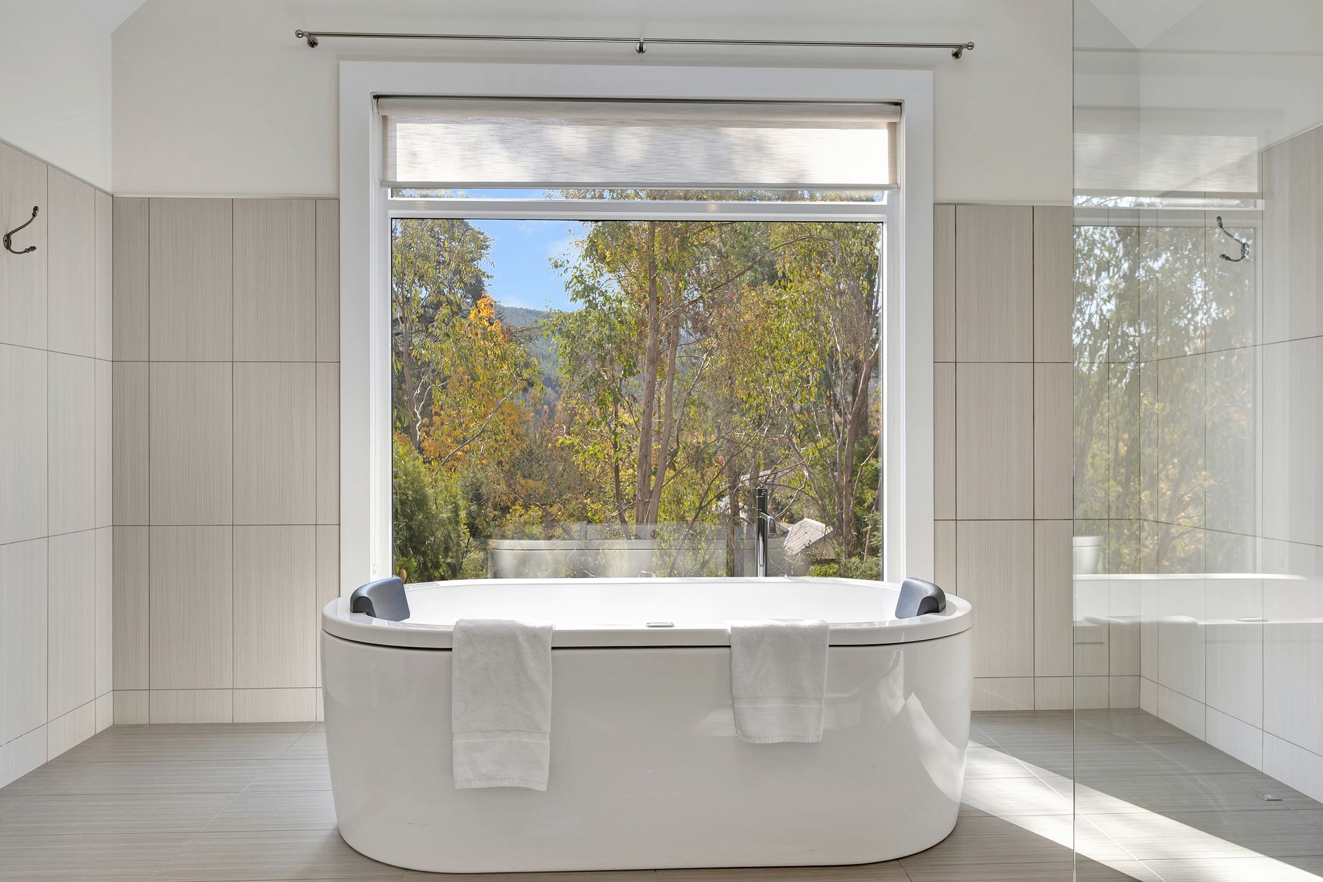This boutique accommodation features two elegant bedrooms, plush furnishings, and a show-stopping bathroom complete with a freestanding spa and rainforest shower. Large windows bathe the interior in natural light, while the gas log fire and soft textiles add a touch of cozy indulgence.