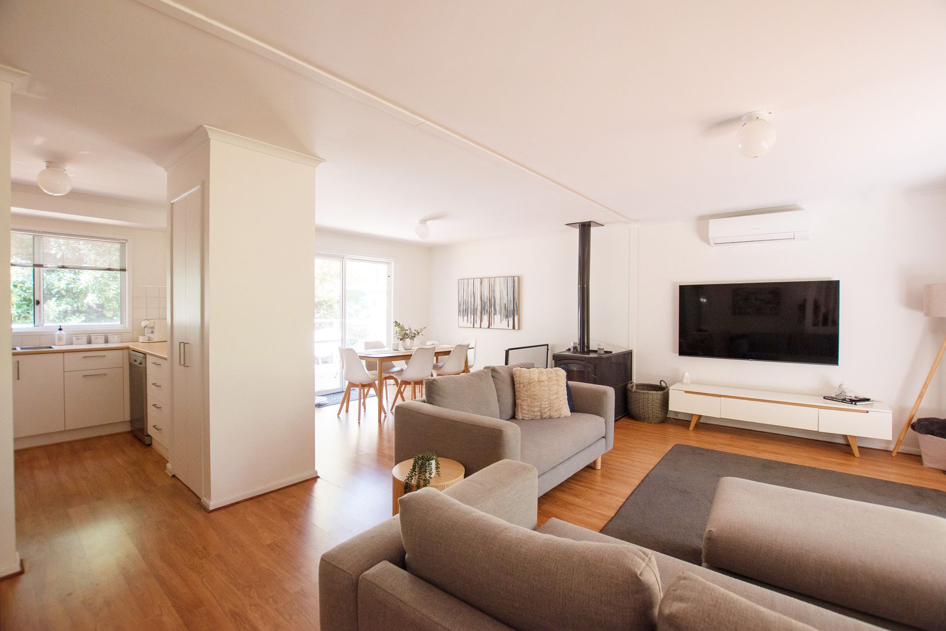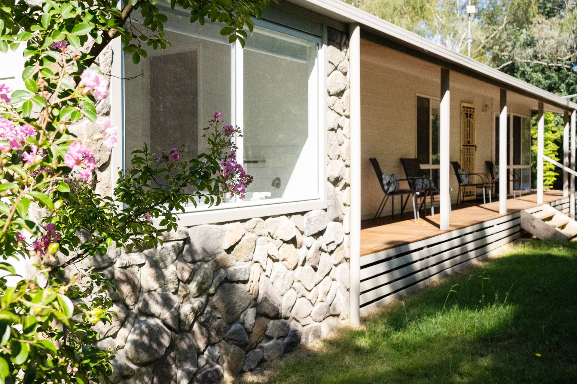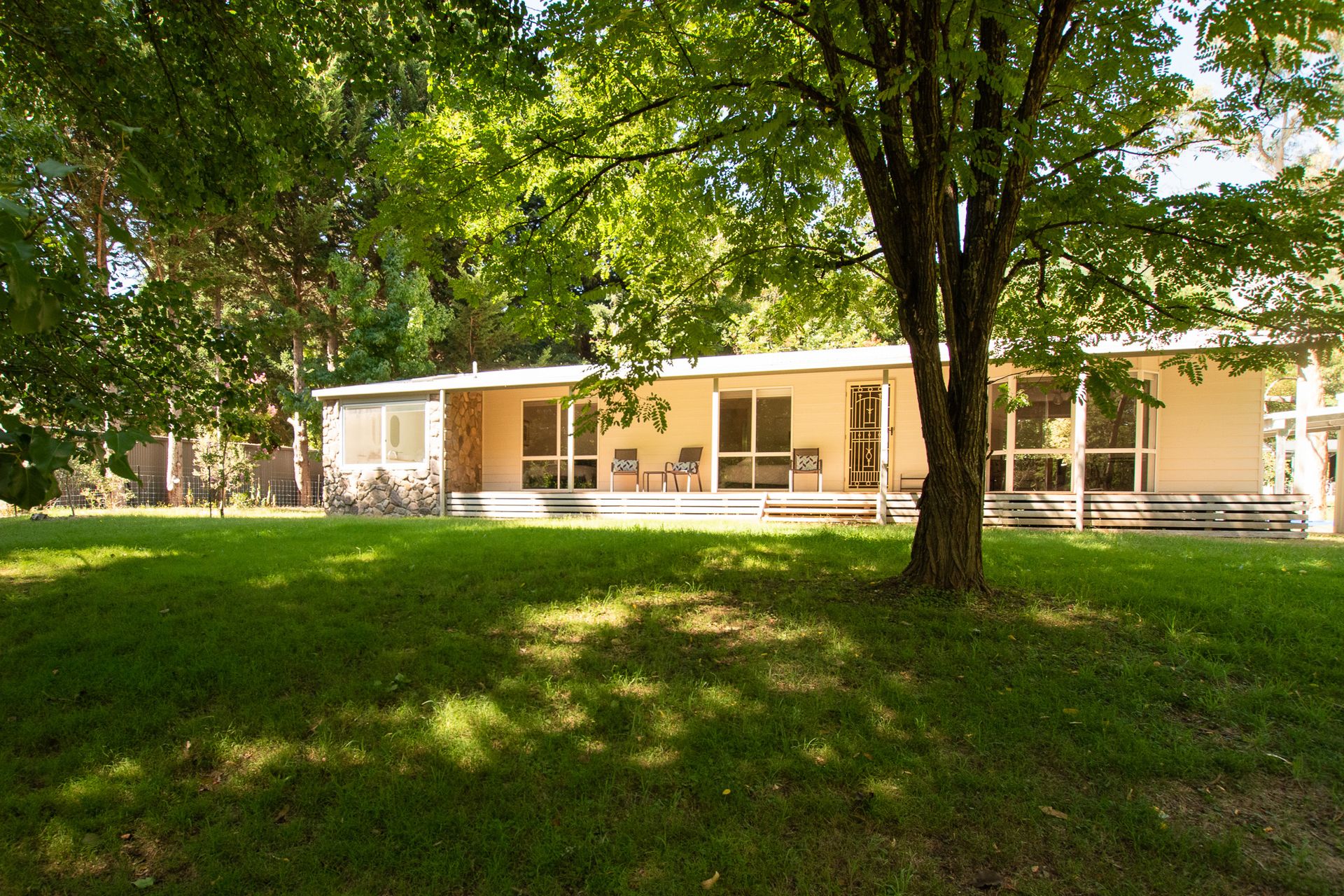 Step into the light-filled open plan living area where warm timber tones and large windows invite sunshine and views of the lush garden. A wood fire keeps things cozy in winter, while reverse cycle air conditioning ensures comfort year-round. The front deck overlooks a generous backyard that leads to the Ovens River perfect for morning coffees, sunset drinks, or simply soaking in the serenity.