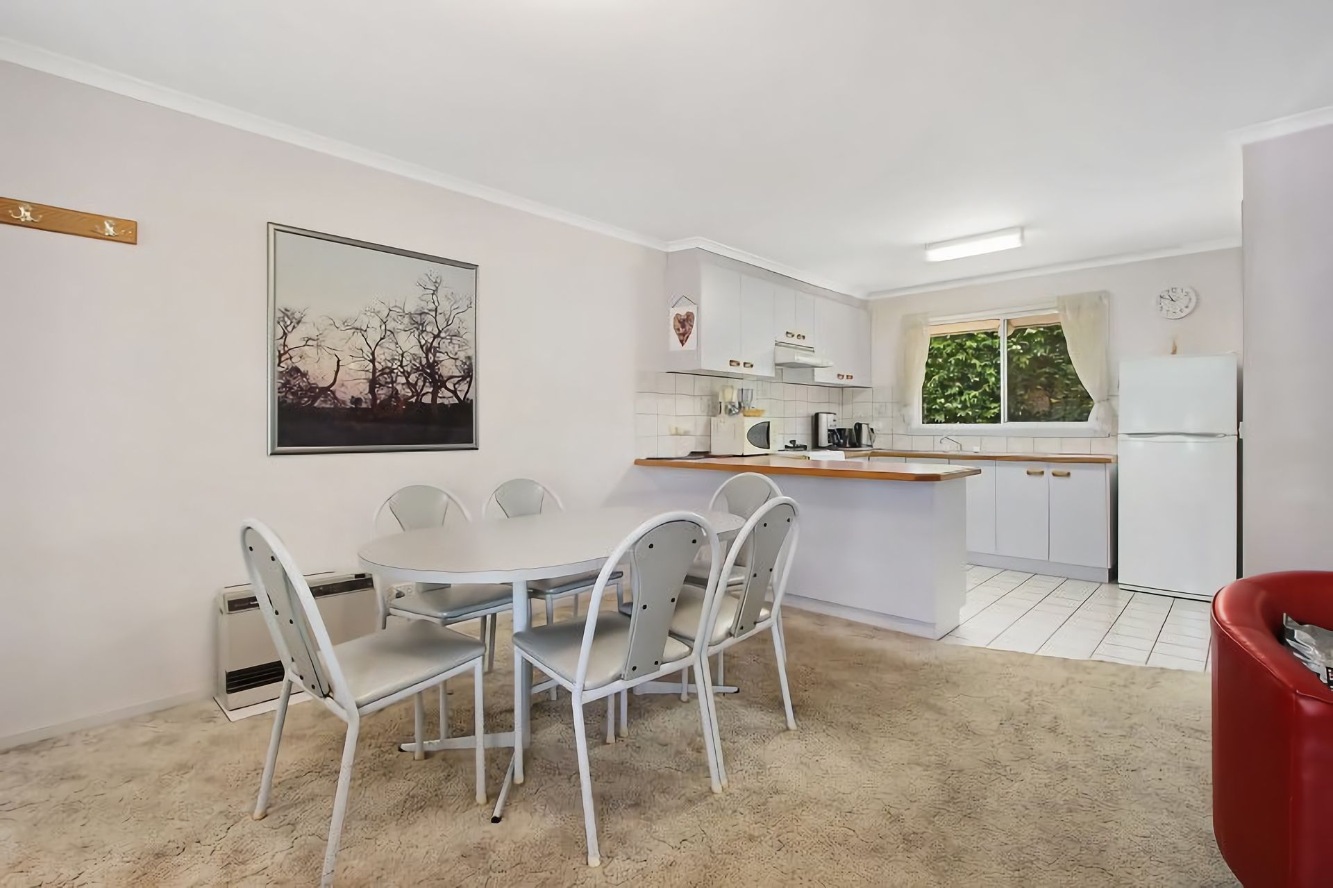 The open-plan living area features a cosy lounge with TV, DVDs, and books for your enjoyment, plus a dining area for six. The fully equipped kitchen includes a new stove, full-size fridge, microwave, and all essential cookware for home-cooked meals.